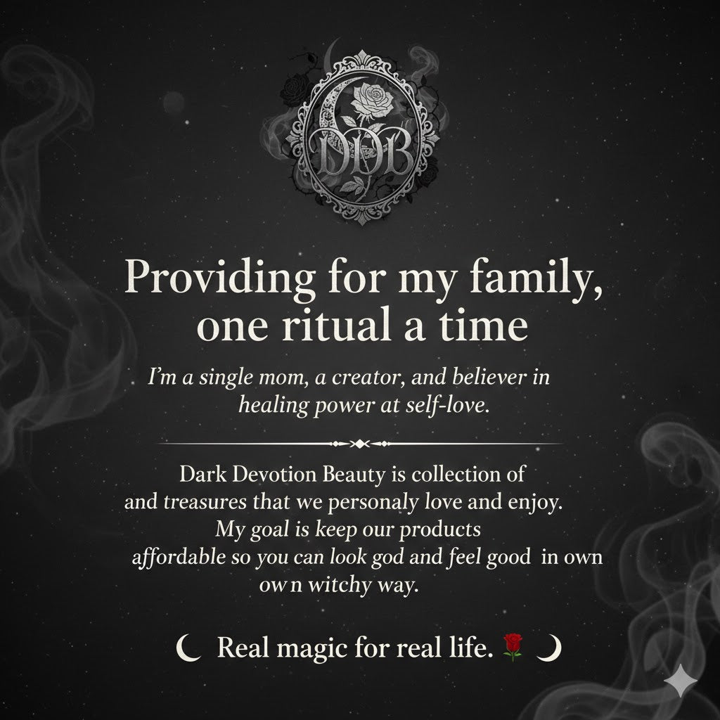 Iām a single mom, a creator, and a believer in the healing power of self-love. Dark Devotion Beauty is a collection of skincare and treasures that we personally love and enjoy. My goal is to keep our products affordable so you can look good and feel good in your own witchy way. Real magic for real life."